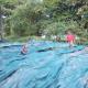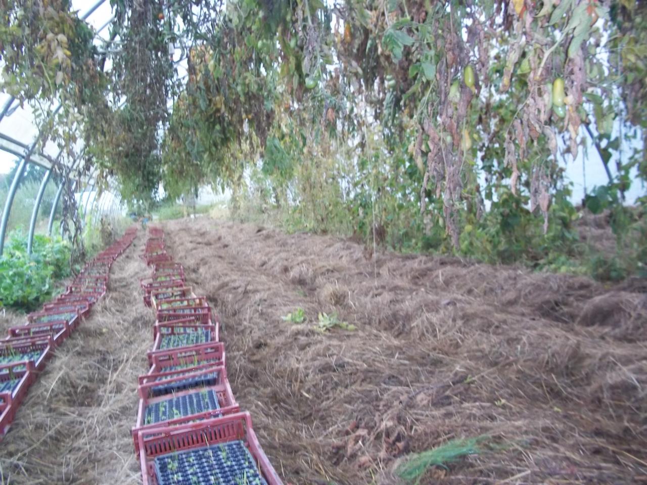 Grande serre, Tomates arrachées et suspendues pour qu'elles finissent de mûrir